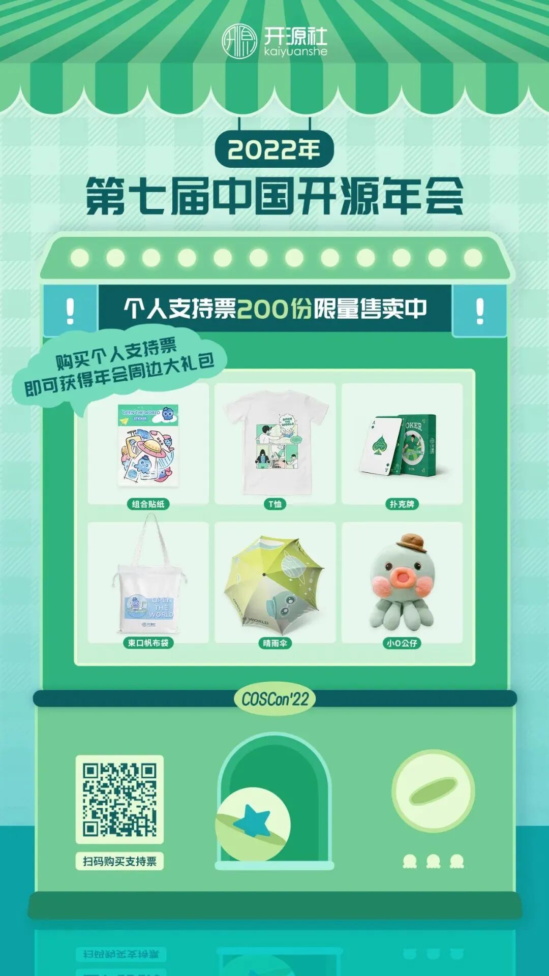 来自设计组的志愿者们为 COSCon'22 设计了丰富精美的社区周边,从贴纸、T 恤、帆布袋,到晴雨伞、扑克牌、小源公仔。购买个人支持票即可获得限量年会大礼包,收集最美社区周边。