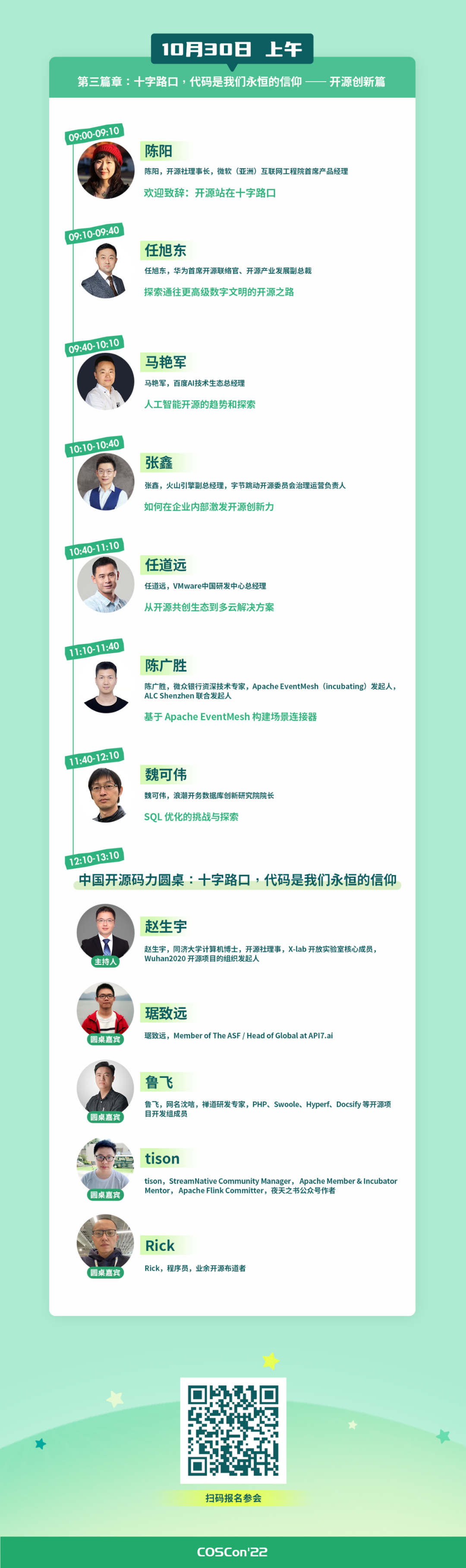 同时还有来自 API7、Timecho、白鲸开源的开源先锋,以及来自华为、微众银行、浪潮、字节跳动等公司的开源技术大咖,中科院计算所副所长、北京开源芯片研究院首席科学家包云岗老师等与大家分享开源在本土的领先探索。