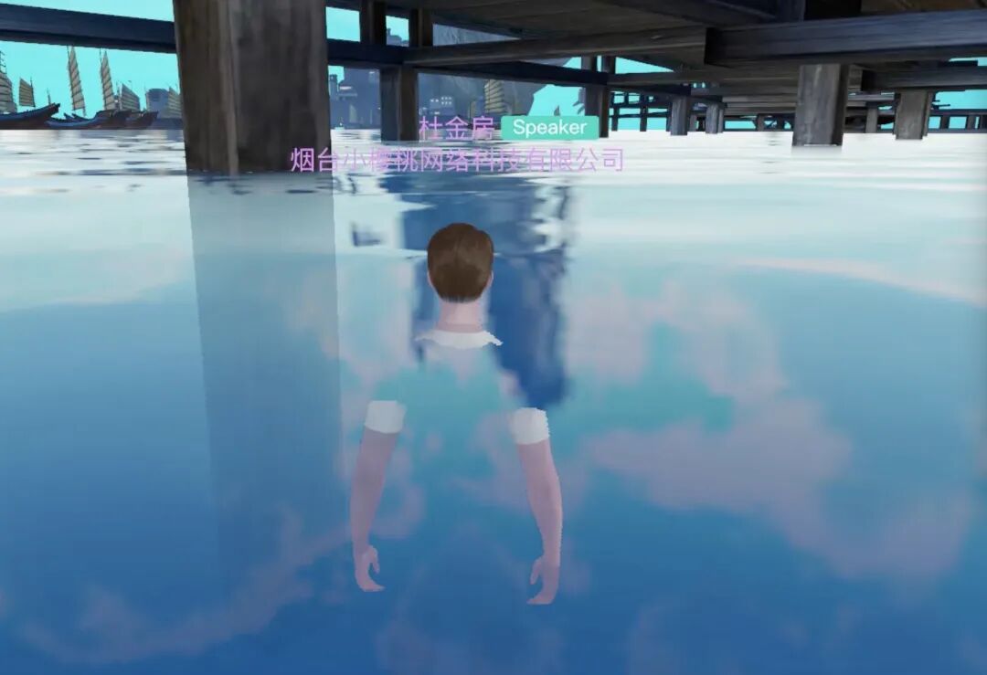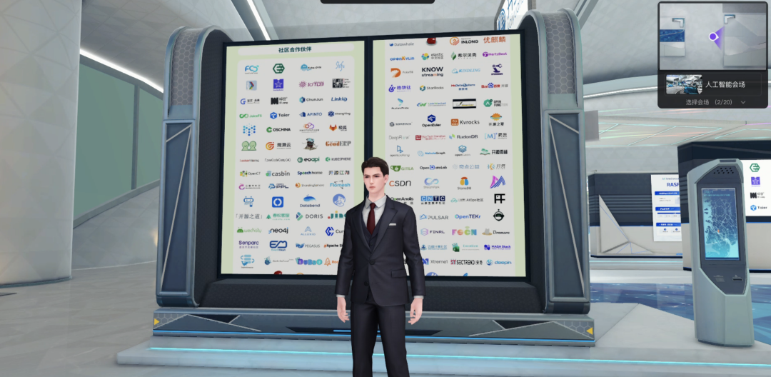在元宇宙里,可以四处走动,可以跑也可以跳,也有“找人”模式——在人员列表里找一个人可以使用Follow功能走到他跟前,跟他交换名片、聊天(Chat),或者开视频单聊也行。Chat支持单聊也支持发给所有人,消息接收者可以看到弹幕。会议组织者精心设计了各种布局和道具。开源大街上有各种赞助商和合作伙伴的产品介绍,Logo墙也成了打卡圣地。
