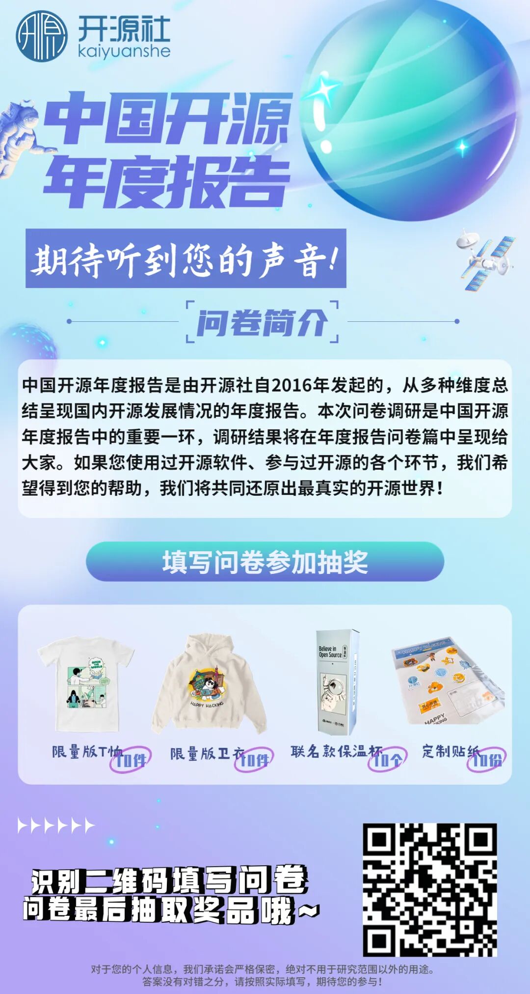 这份问卷是我们每年开源年度报告的重要一环,不基于调研的分析报告不过是纸上谈兵。我们希望能够收集到多样、全面的数据样本。与往年类似,今天我们继续发布这份中国开发者调查问卷,问卷从两个角度展开,其中包括个人信息(包括工作信息和开发者技术信息)和开源社区参与情况,今年我们加入了开源社区度量和开源商业化相关的话题,欢迎大家参与问卷并发表自己的想法。